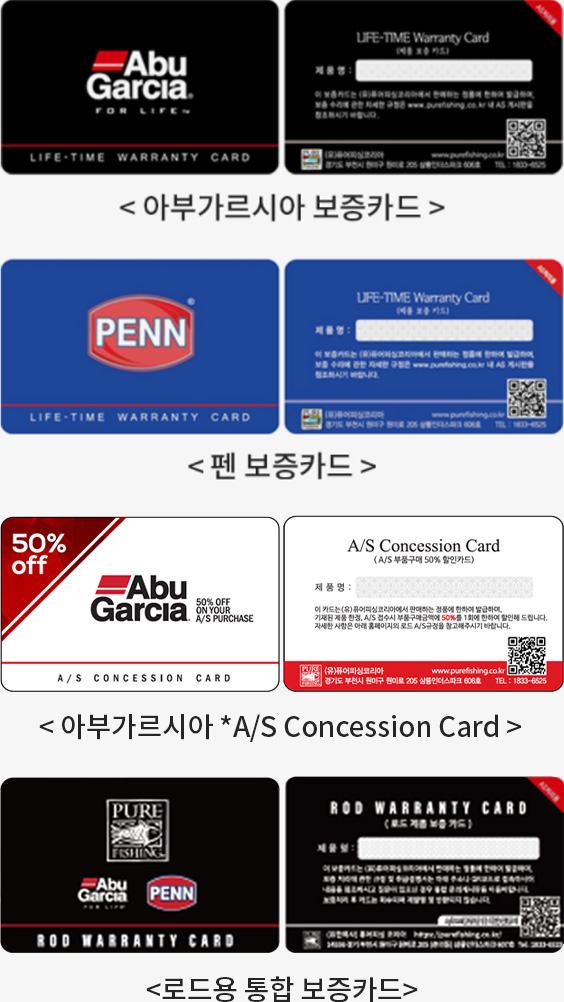 - 2절 낚시대 중 10만원 이하의 일부 제품에 한하여 A/S처리시 1회 한정, 부품구매 가격을 50% 할인해 드리는 [A/S Concession Card]가 발행됩니다.