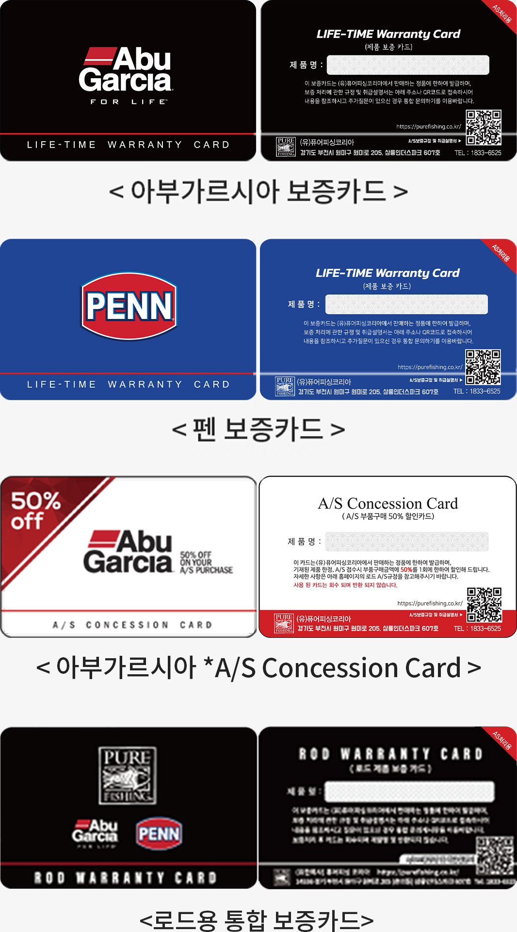 모든 낚시용 릴의 A/S는 보증카드와 A/S처리를 받을 제품이 반드시 동봉되어야 하며, 이중 하나라도 없을 경우 A/S가 불가함을 알려드립니다.