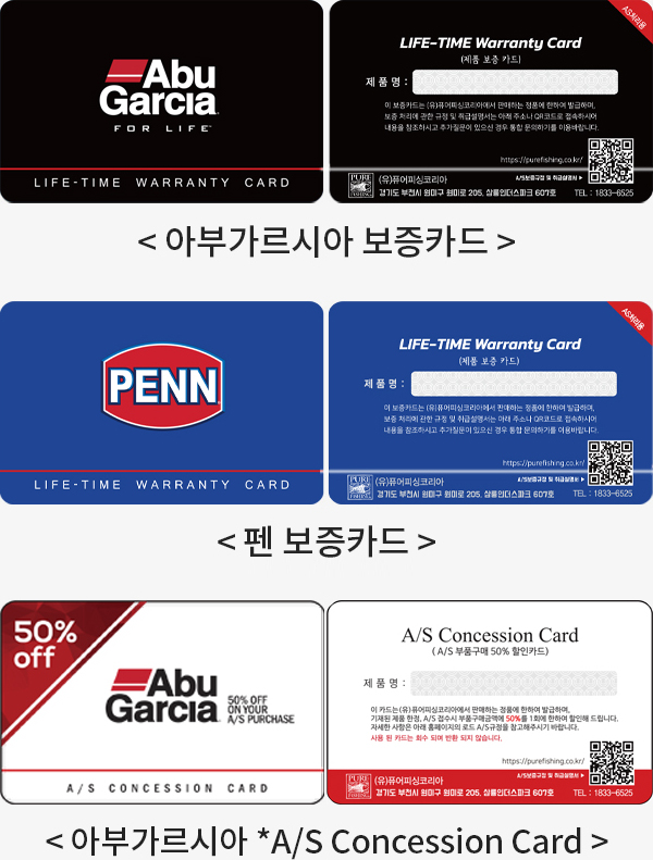 - 2절 낚시대 중 10만원 이하의 일부 제품에 한하여 A/S처리시 1회 한정, 부품구매 가격을 50%할인해 드리는 [A/S Concession Card]가 발행됩니다.